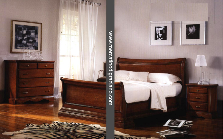 Descrizione: Letto matrimoniale a barchetta in pioppo intarsiato su