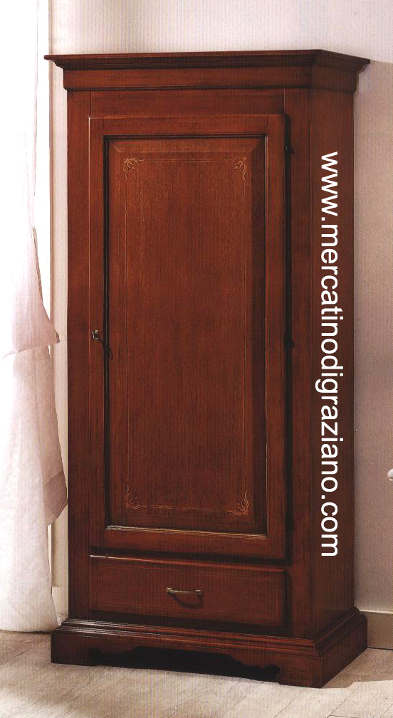 Descrizione: Armadio 1 porta 1 cassetto in pioppo intarsiato su noce. Dimensioni: L. 96 P. 56 H. 197 SUPER-PREZZO (Iva inclusa): € 725,00